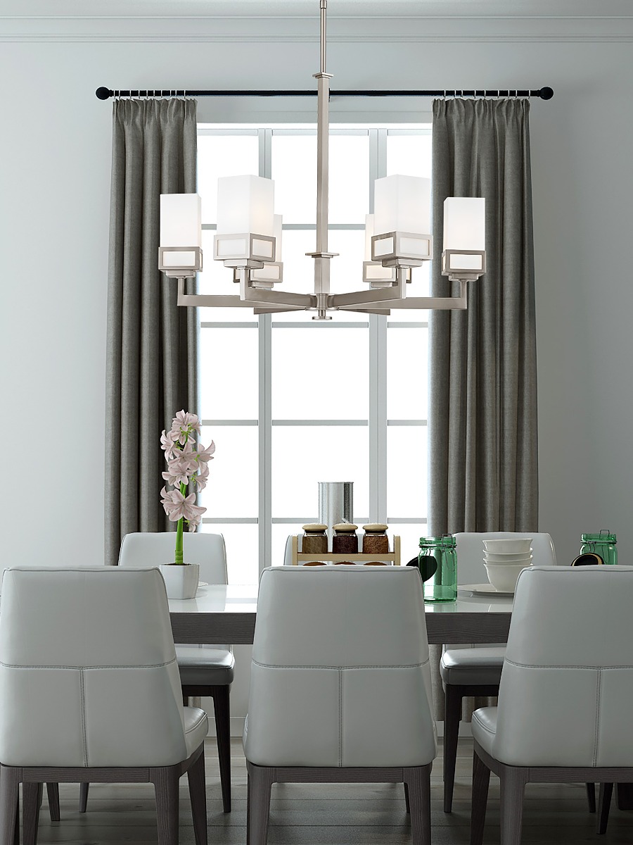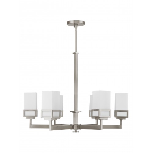 The transitional style of the Harding six light chandelier features an eye-catching satin opal white glass shade floating inside a unique double forged square design in a brushed nickel finish.