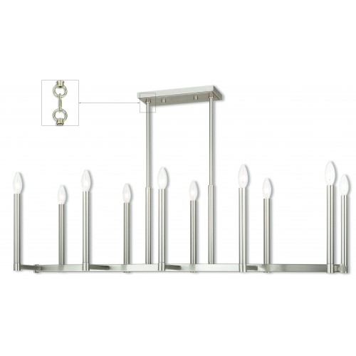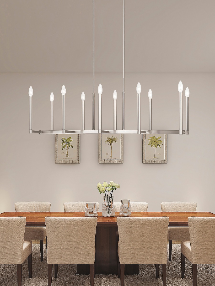 Simply formed yet elegant in design, this ten light linear chandelier commands attention. From the clean lines to the sleek tall candle sleeves, this linear chandelier makes a dramatic statement.