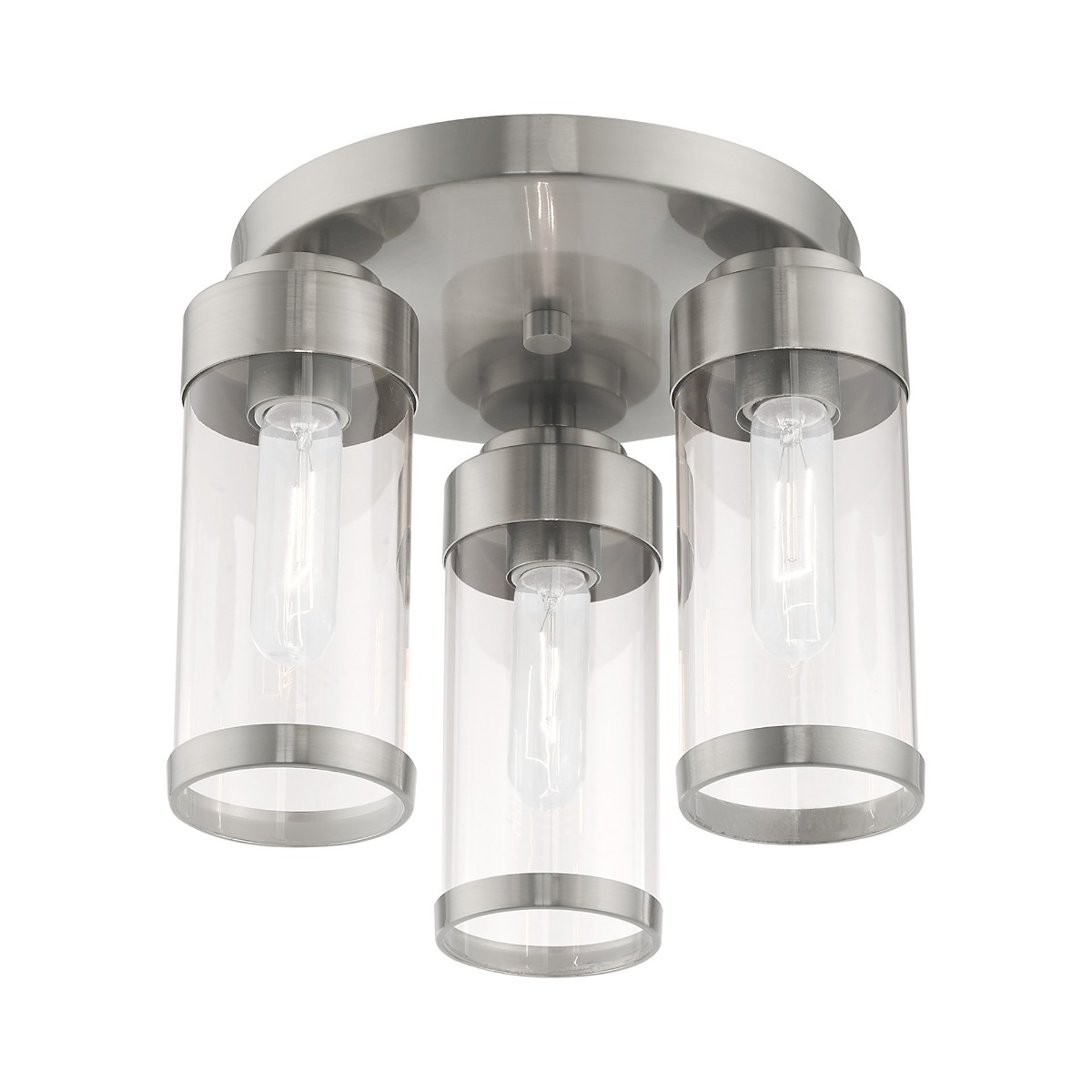 The three light ceiling mount from the Hillcrest collection features a simple elegant brushed nickel frame paired with clear glass shades. Each shade is accented with a banded brushed nickel ring to carry through the theme of finely crafted metal fittings.