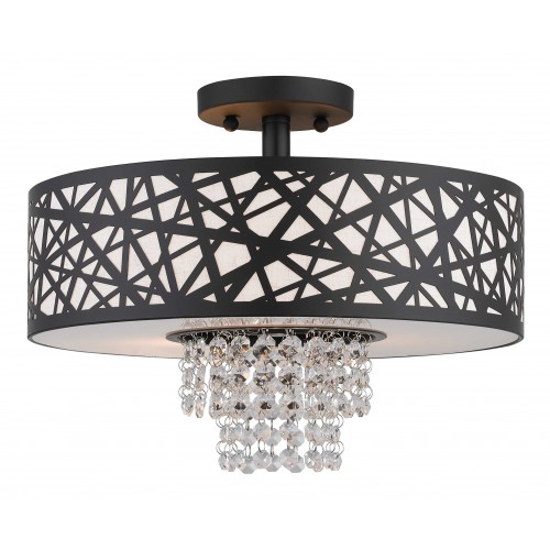 This spectacular bronze three light semi flush mount will take your home decor to the next level. Inspired by a bird nest, the laser-cut metal sheath surrounds an oatmeal fabric hardback shade with strands glistening of clear crystal.