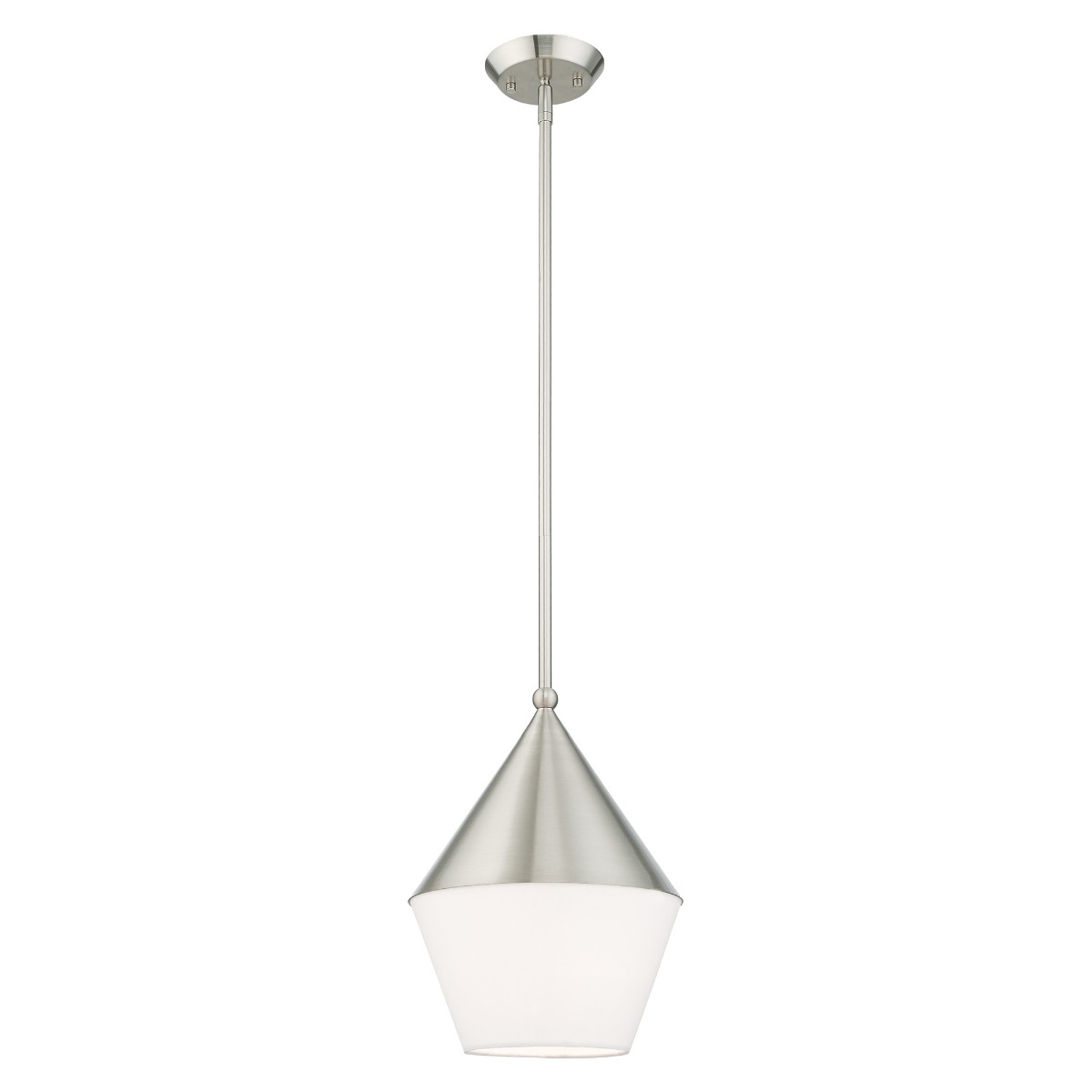 The unique design of the Stockholm mini pendant merges different materials to create a truly eye-catching fixture. The brushed nickel body is accented by a hand crafted off-white hardback shade around the bottom creating a distinct mid century modern look.