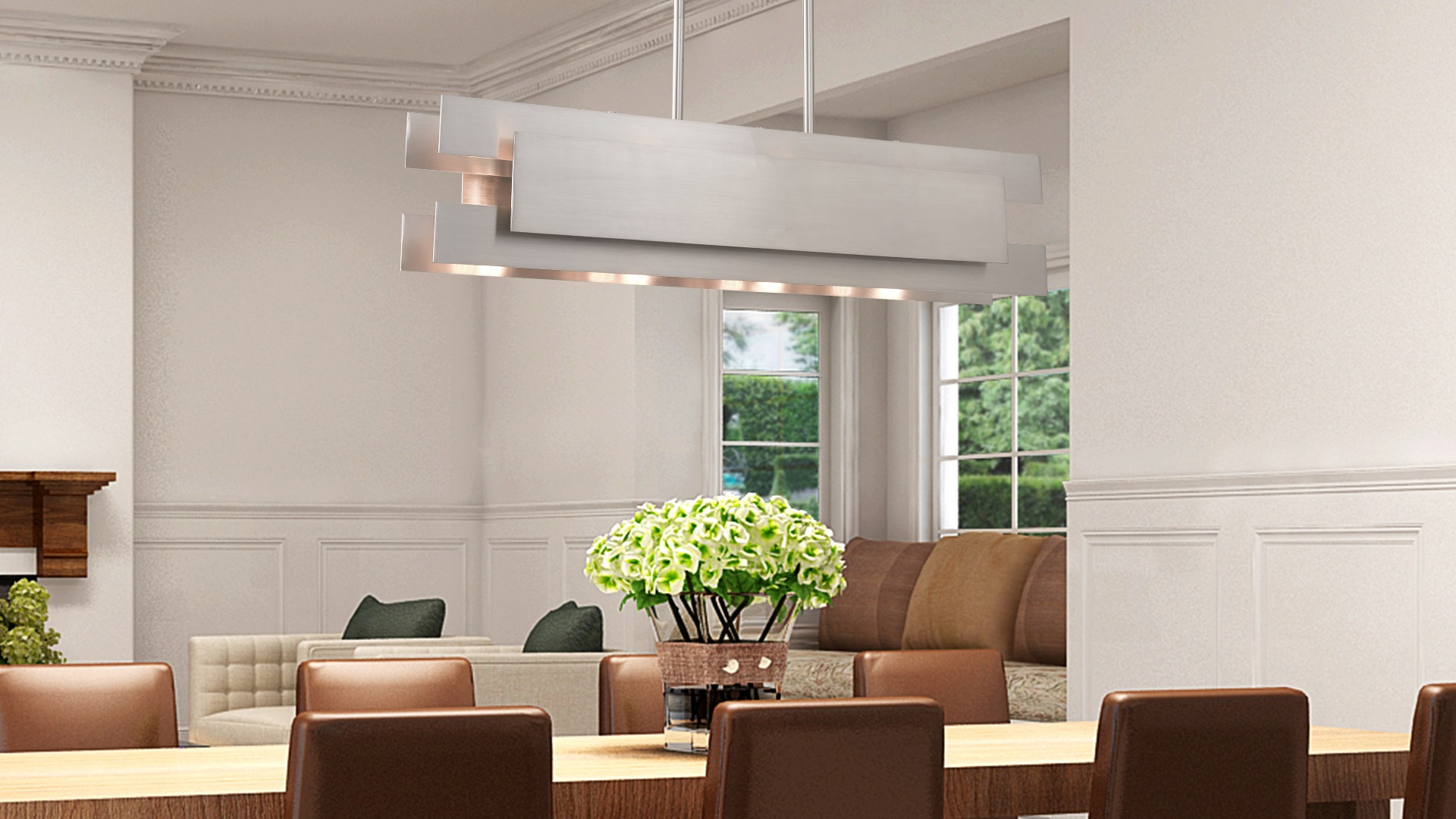 This stylish, modern four light linear chandelier features a chic look and can be mounted any where in the home from over a kitchen island or table to over the pool table in the game room. Its light design is created with square and rectangular panels of steel in a brushed nickel finish.
