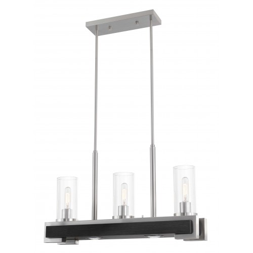Inspired by industrial and farmhouse style lighting, this beautiful brushed nickel with espresso faux wood three light linear chandelier is perfect in a kitchen or above a long dining table. Features two LED down lights for added ambiance.