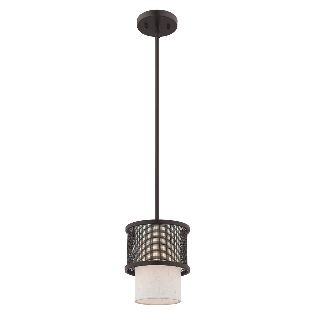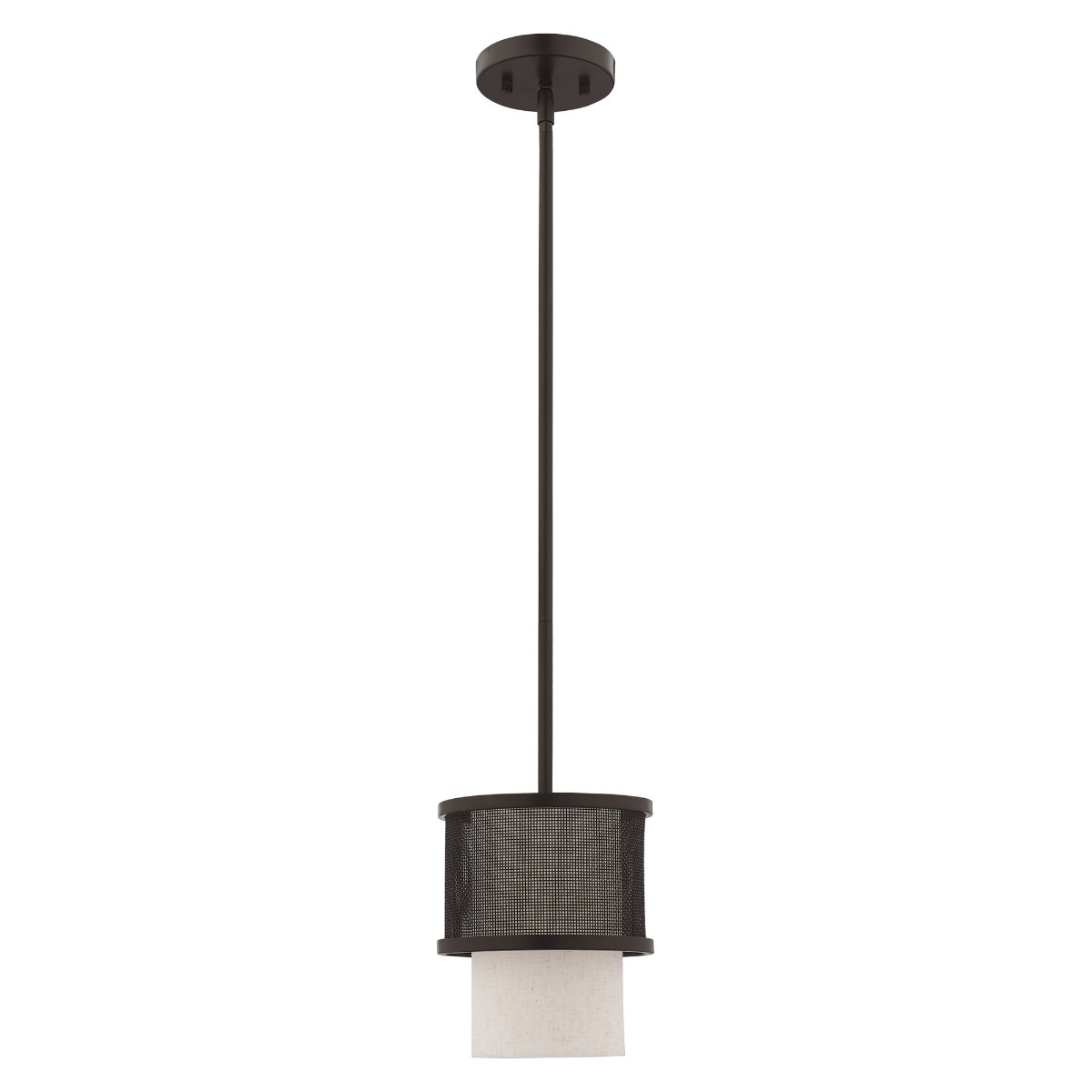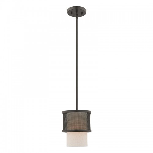 Elevate your modern living area with this urban bronze mini pendant featuring a hand crafted hardback oatmeal fabric shade cloaked in stainless steel mesh outer shade.