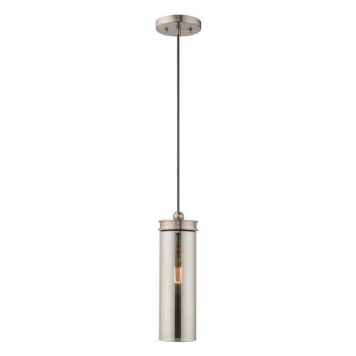 Blending modern aesthetic with industrial-chic design, this hanging mini pendant has a sleek smoke cylinder shaped glass which is suspended by brushed nickel hardware.