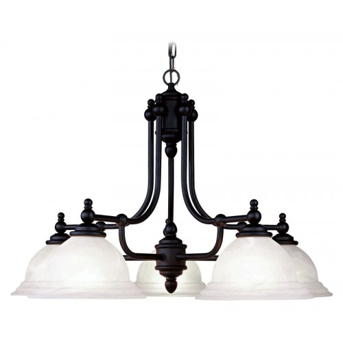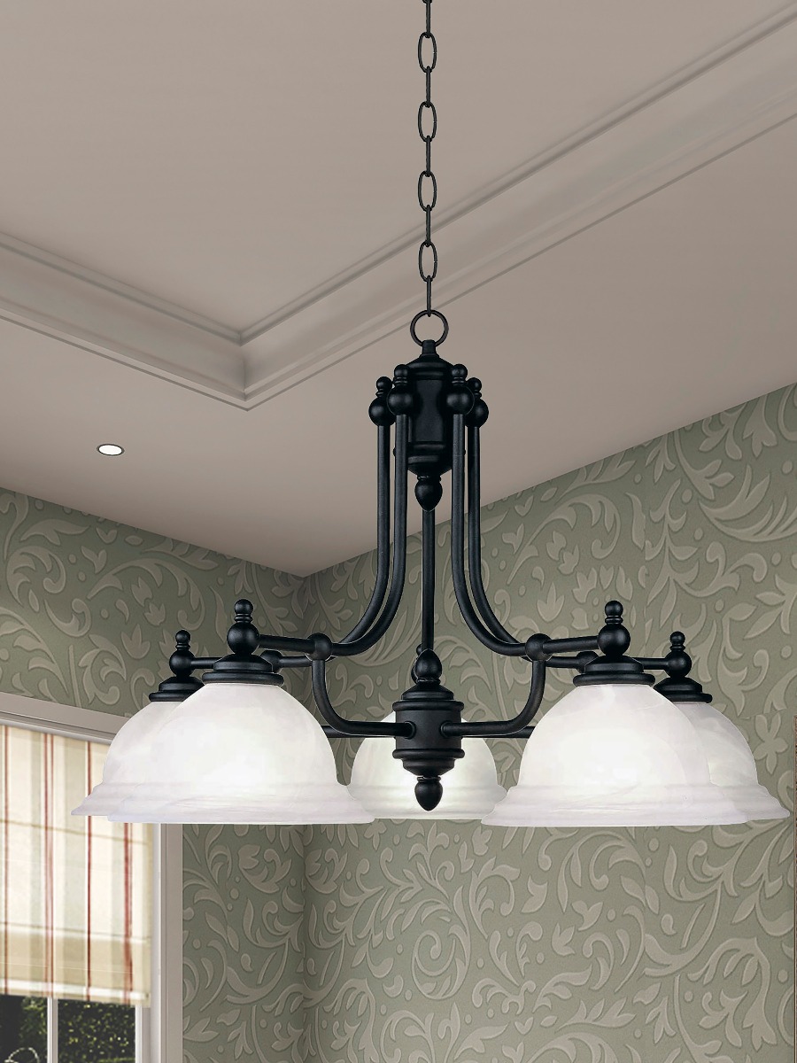 This chandelier adds a clean, transitional, luminance to your decor. The black finish contrasts with white alabaster glass resulting in a distinctive lighting accent.