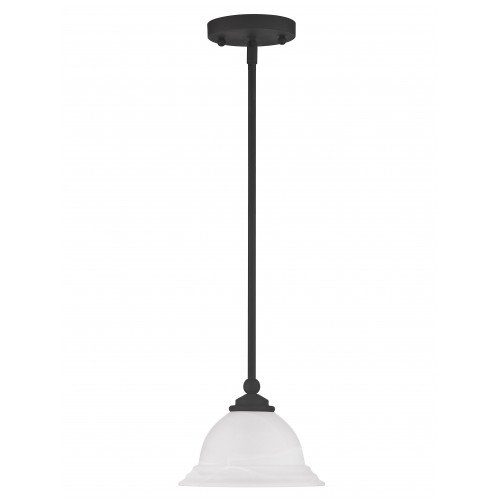 This mini pendant adds a clean, transitional, luminance to your decor. The black finish contrasts with white alabaster glass resulting in a distinctive lighting accent.