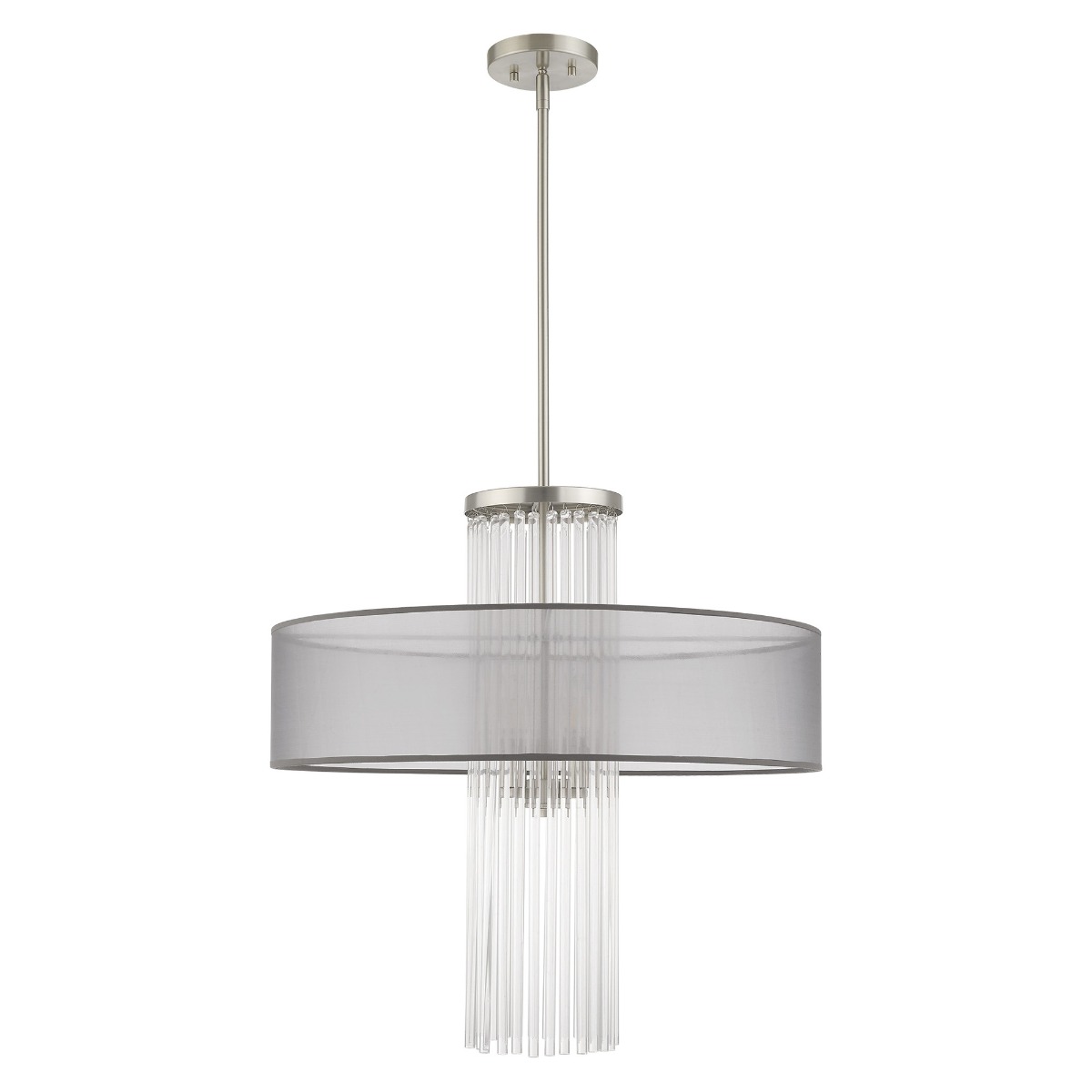 Dazzle contemporary decor schemes with the upscale feel of this pendant chandelier fixture. The Alexis fills a bling quotient with beautiful grade-A K9 crystal rods that cascades from a brushed nickel base with a hand crafted translucent gray shade.