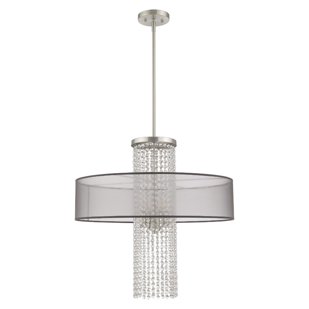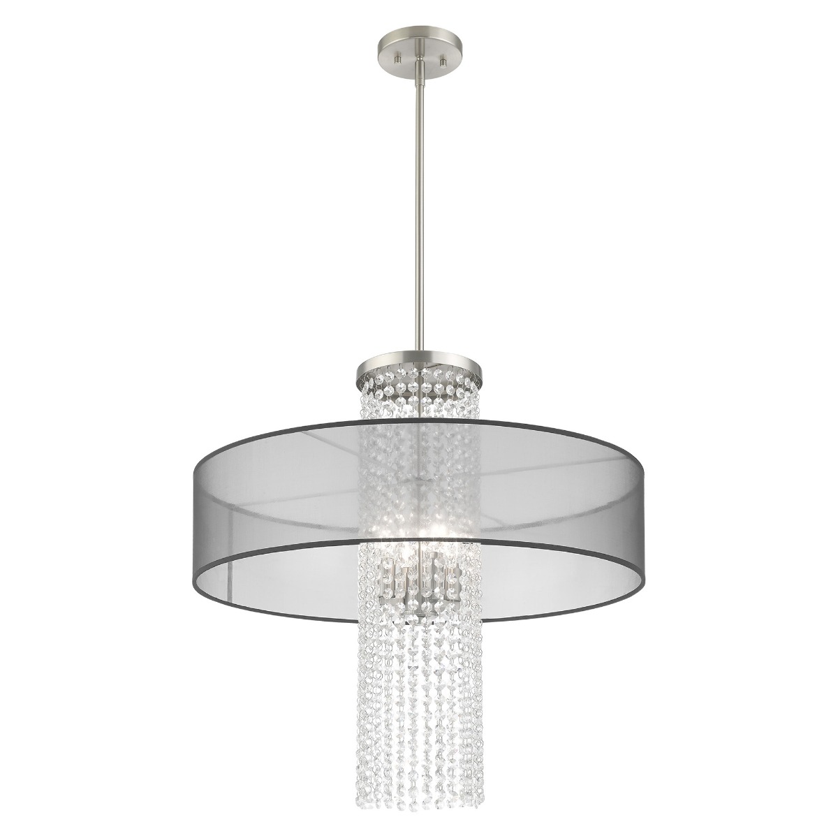 The Bella Vista collection features a hand crafted translucent black shade over a brushed nickel finish and clear crystal strands cascading in a waterfall effect to convey the glitz and glamour from an iconic time that is making a modern comeback.