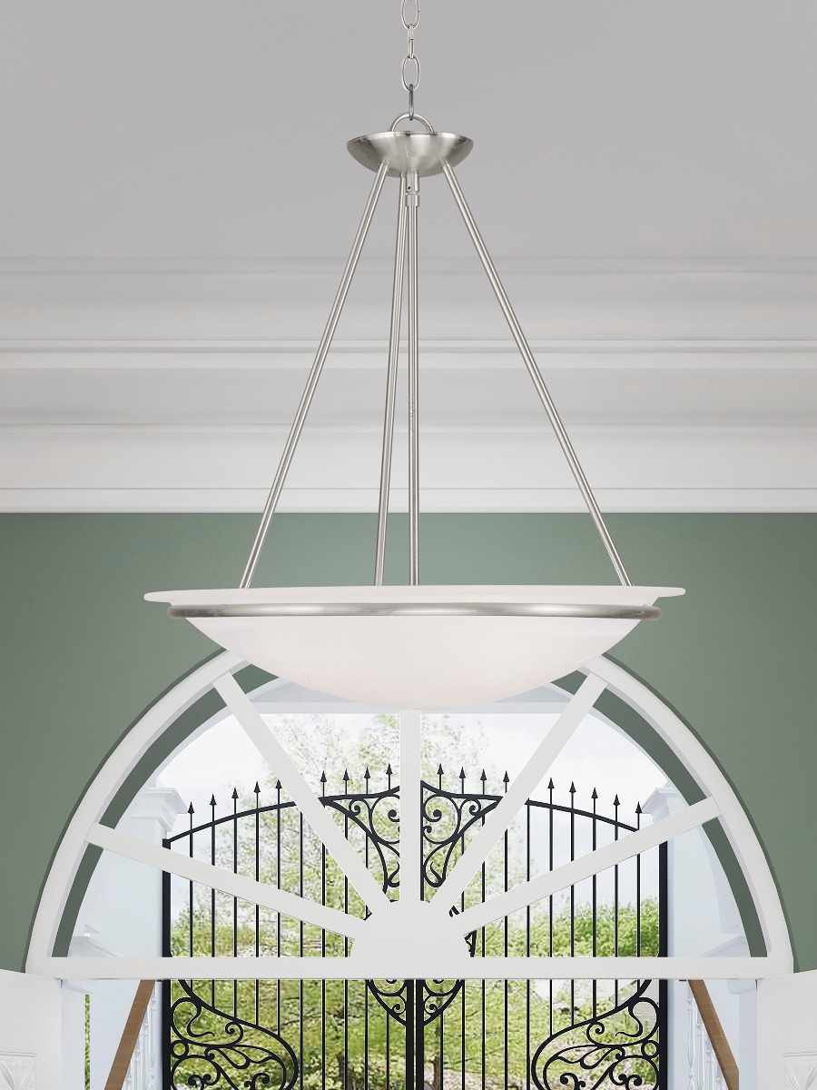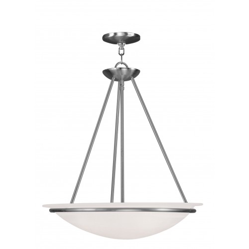 This three light pendant features a lustrous brushed nickel finish with light glowing from within the large white alabaster glass bowl shape shade. complete a kitchen or dining room with this beautiful pendant.