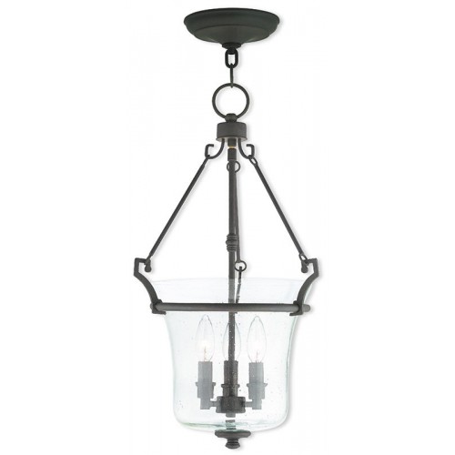 The hand crafted seeded glass on this bronze Buchanan chain hung bell jar lantern reflects and enhances these lights for a mesmerizing effect.