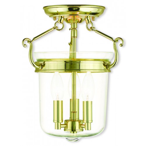 A hand crafted clear glass holds three candelabra bulbs in this wonderful semi flush mount bell jar lantern. Polished brass finish adorns the hardware and round canopy.