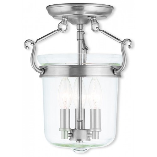A hand crafted clear glass holds three candelabra bulbs in this wonderful semi flush mount bell jar lantern. Brushed nickel finish adorns the hardware and round canopy.