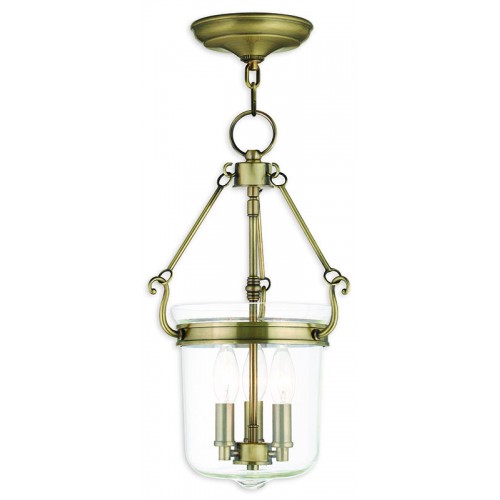 A hand crafted clear glass holds three candelabra bulbs in this wonderful chain hung bell jar lantern. Antique brass finish adorns the chain, hardware and round canopy.