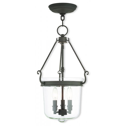 A hand crafted clear glass holds three candelabra bulbs in this wonderful chain hung bell jar lantern. Bronze finish adorns the chain, hardware and round canopy.