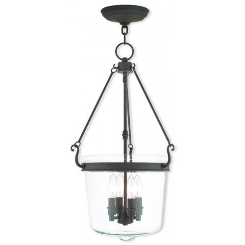 A hand crafted clear glass holds four candelabra bulbs in this wonderful chain hung bell jar lantern. Bronze finish adorns the chain, hardware and round canopy.