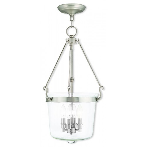 A hand crafted clear glass holds four candelabra bulbs in this wonderful chain hung bell jar lantern. Brushed nickel finish adorns the chain, hardware and round canopy.
