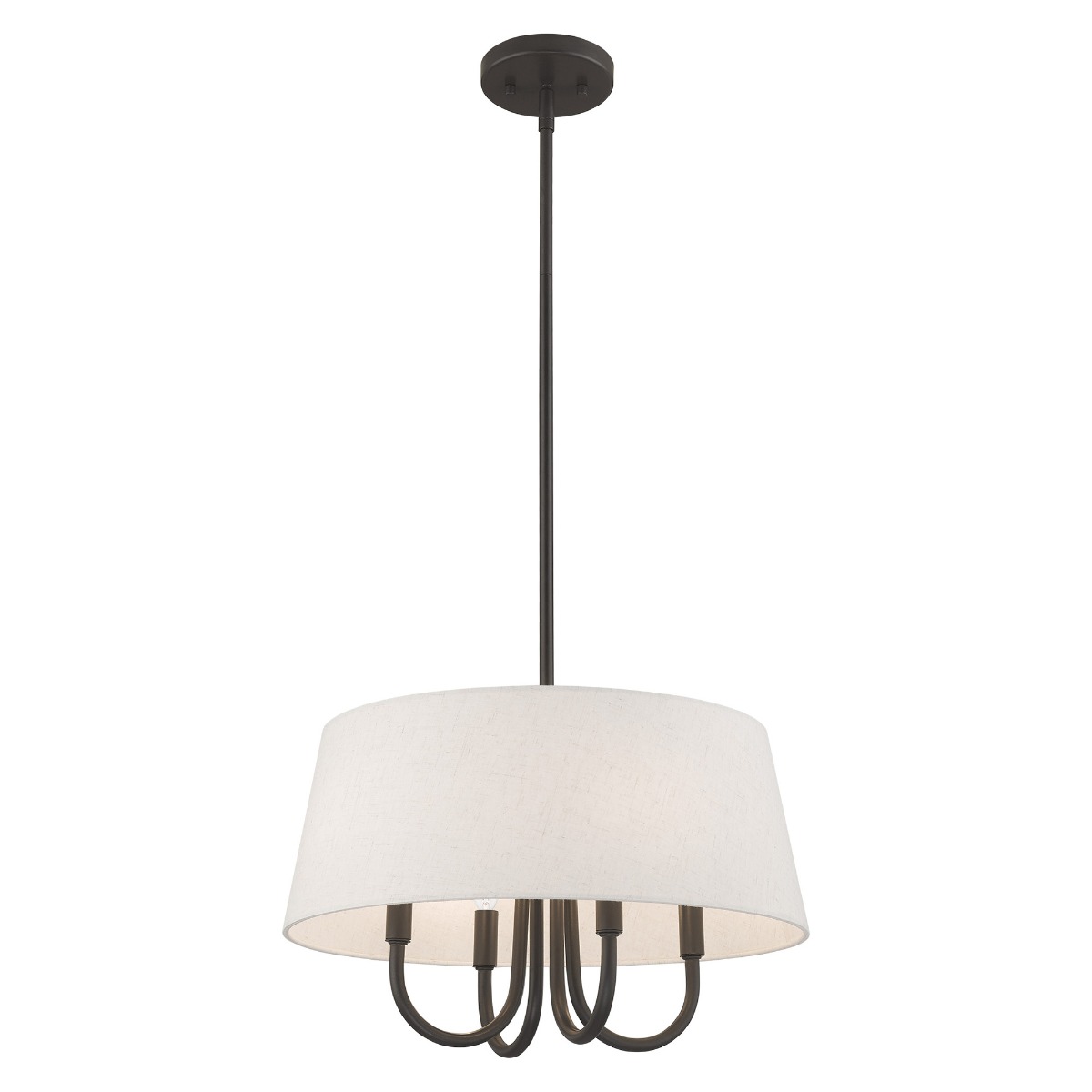 Add a dash of stylish sophistication with this sleek and contemporary pendant chandelier. The design features a English bronze frame and a beautiful hand crafted oatmeal hardback drum shade.