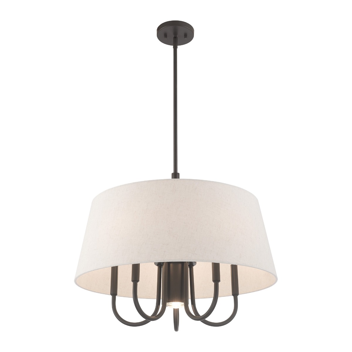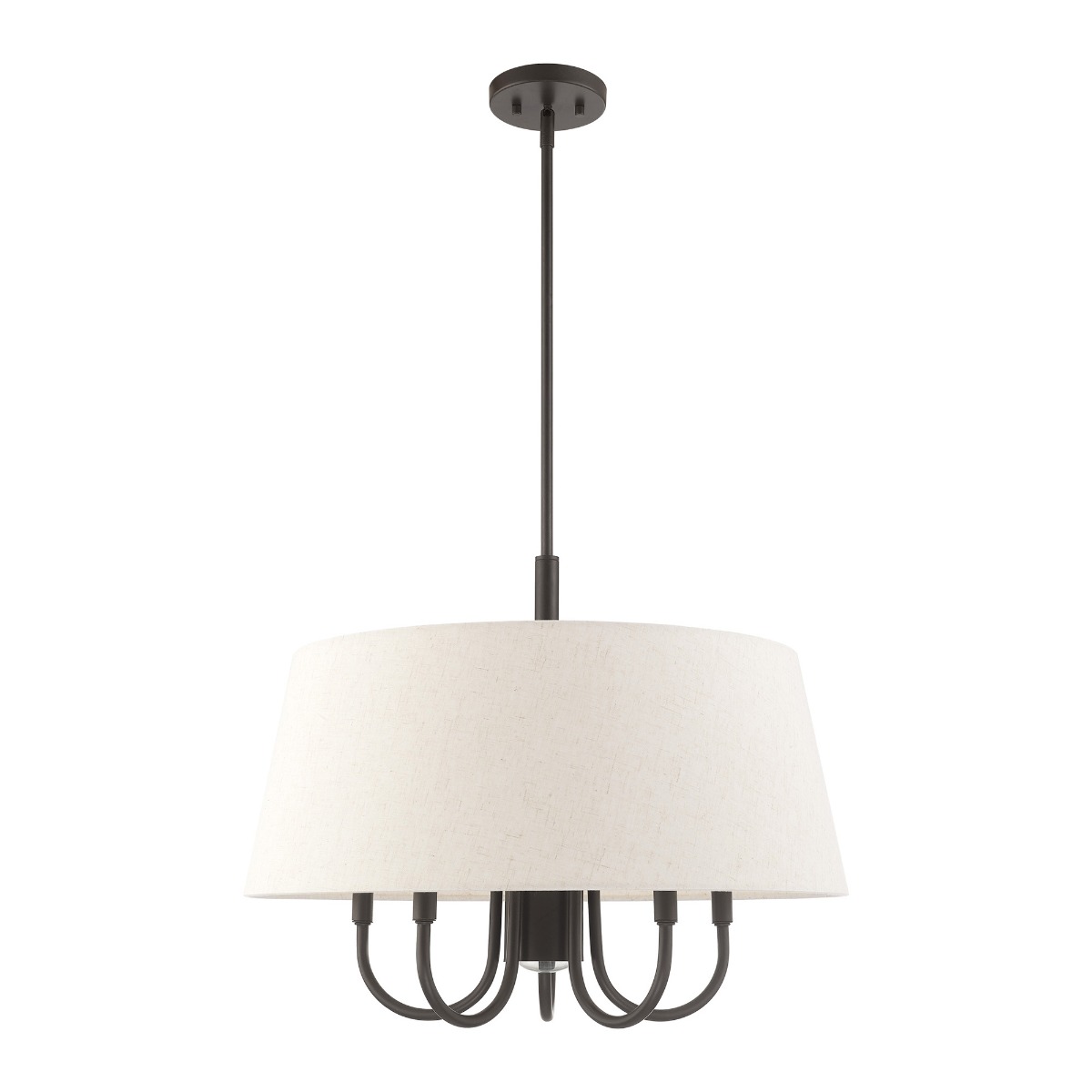 Add a dash of stylish sophistication with this sleek and contemporary pendant chandelier. The design features a English bronze frame and a beautiful hand crafted oatmeal hardback drum shade.