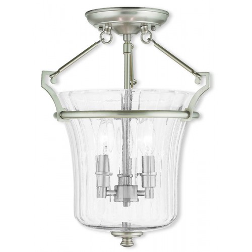 This sophisticated semi flush mount is perfect for your traditional or trasitional style home decor. A decorative had crafted fluted clear glass is suspended from a brushed nickel caopy by three rod attachments.