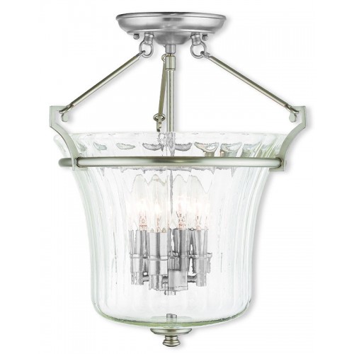 This sophisticated semi flush mount is perfect for your traditional or trasitional style home decor. A decorative had crafted fluted clear glass is suspended from a brushed nickel caopy by three rod attachments.