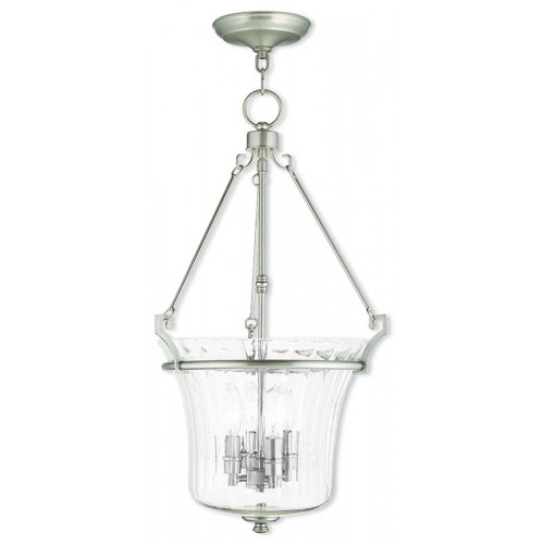 This sophisticated chain hung latern is perfect for your traditional or trasitional style home decor. A decorative had crafted fluted clear glass is suspended from a brushed nickel caopy by three rod attachments.