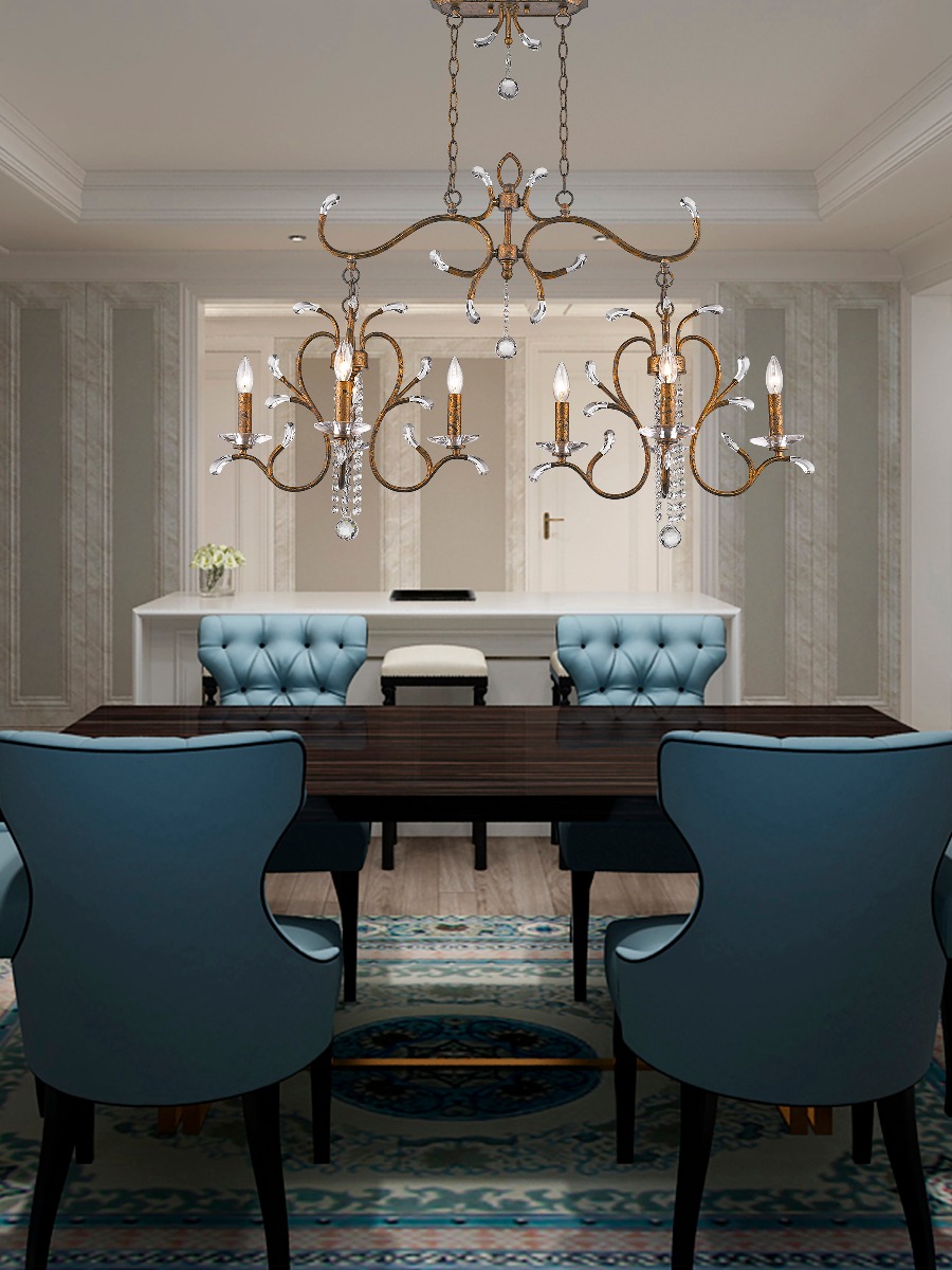 The delicate design of this wonderful eight light linear chandelier means radiant style for your home. A hand applied golden bronze finish adorns the frame, while clear cut polished glass crystal accents dangle below. A clear crystal dish bobeche holds each candle into place.