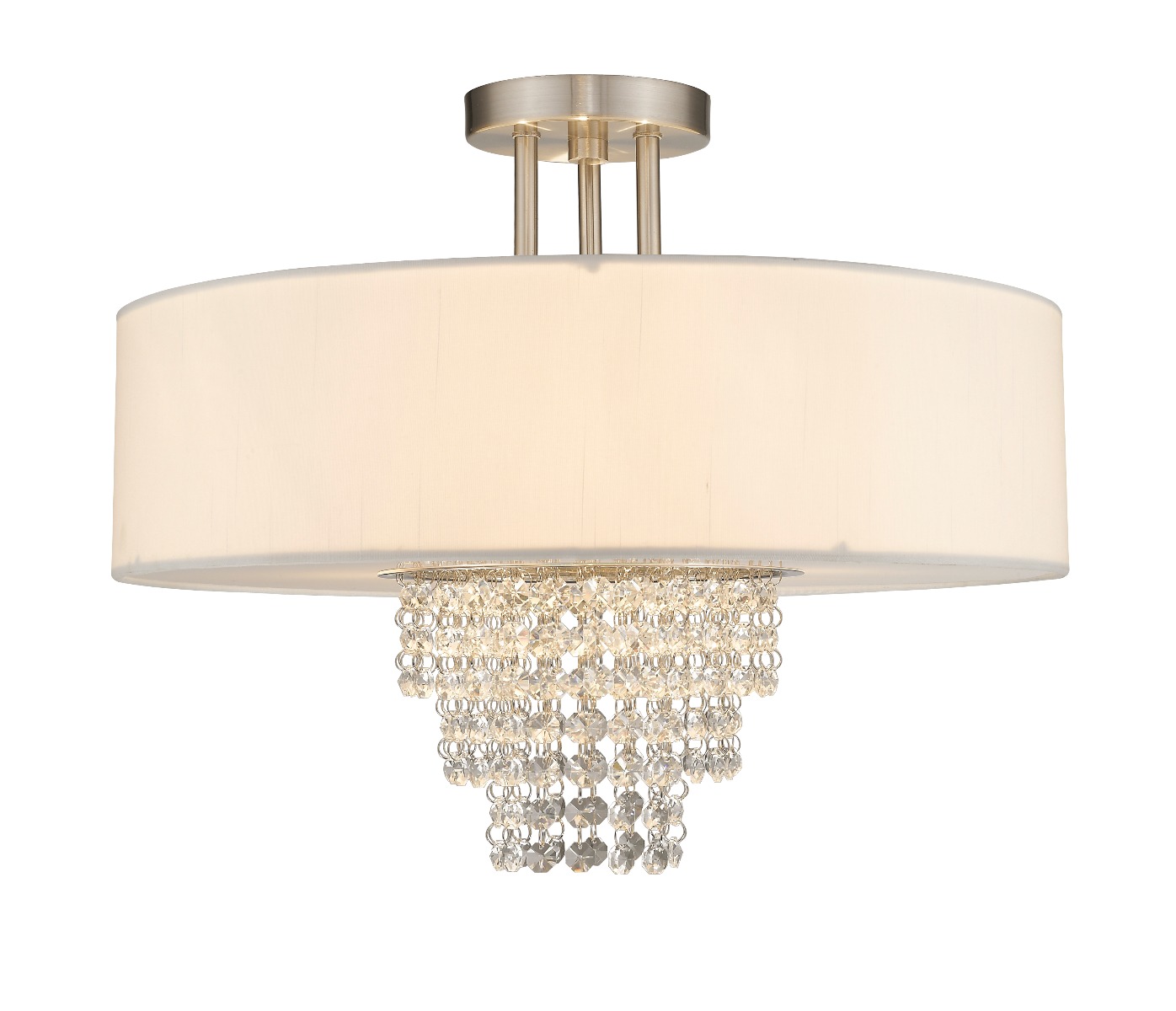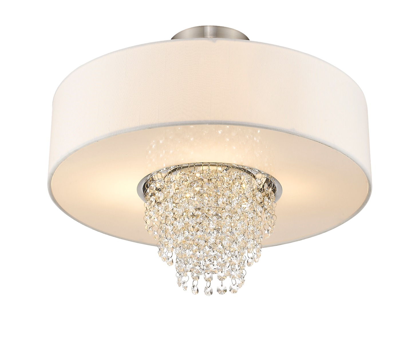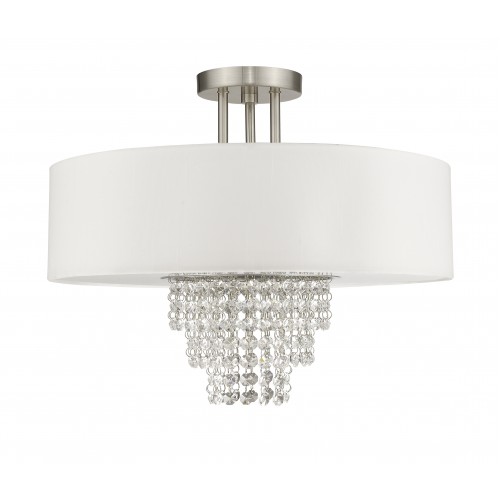 A contemporary style semi flush mount from the Carlisle collection. The design features a brushed nickel housing and canopy, with hanging strands of beautiful clear crystal. A hand crafted off white fabric hardback drum shade surrounds the crystals and fixture frame, and creates a magnificently sophisticated look.