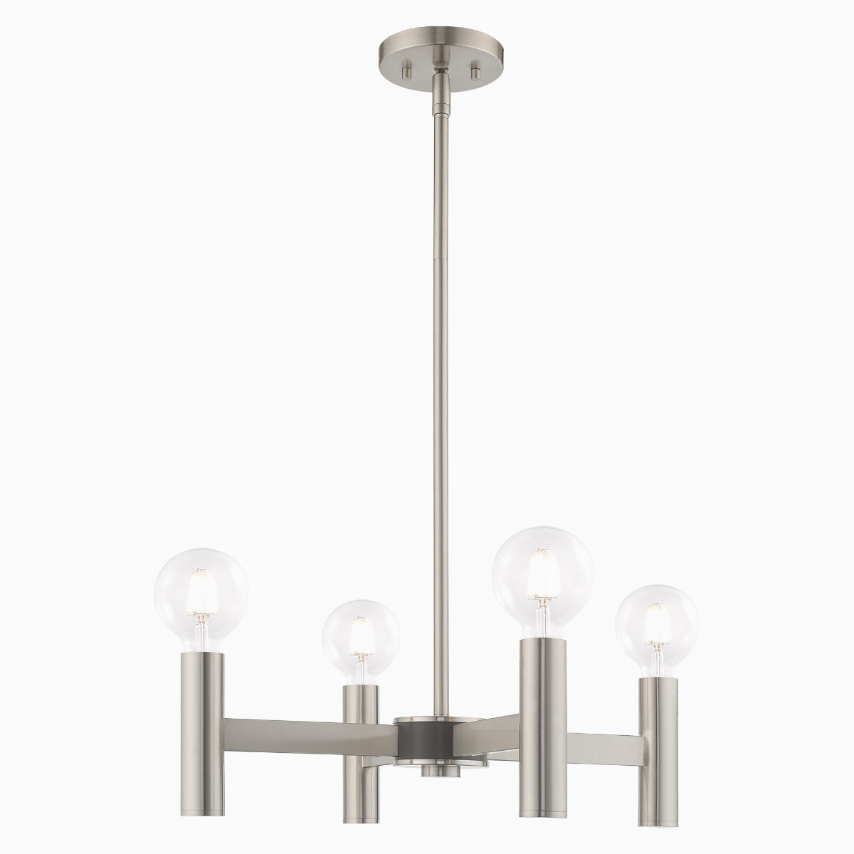 Exposed bulb sockets are fixed over brushed nickel with bronze accent to create an eclectic look perfect for mid century modern or transitional spaces wanting an industrial touch.