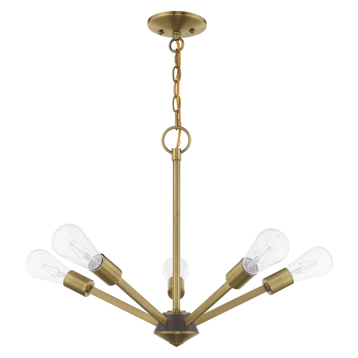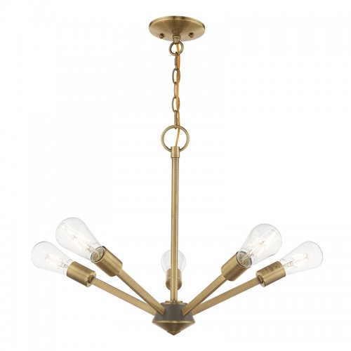 Add eye-catching lighting to your home decorating with the lively look of the Prague chandelier in antique brass with bronze accents chandelier. The five light design features vintage style Edison bulbs that up the style factor, giving it an attractive, mid-century modern and industrial edge.