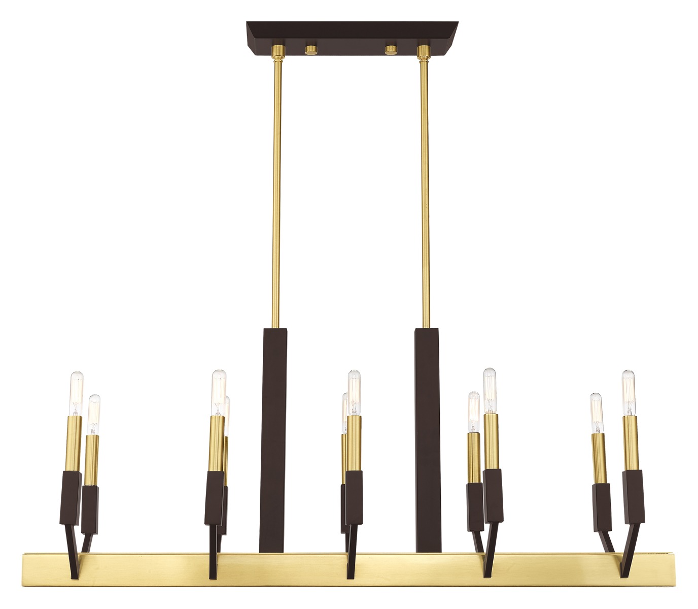 Illuminate your home with bright designs from the Beckett collection. The ten light linear chandelier emulates a mid-century modern style made popular in the 50s and 60s. The satin brass frame is accented with bronze accents, helping to fully complete this look.