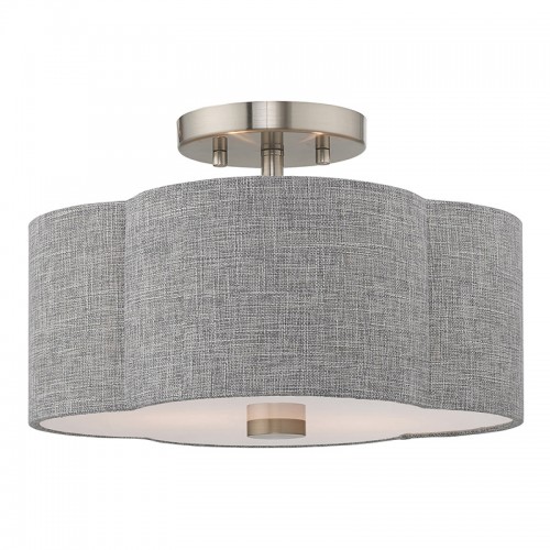 The brushed nickel frame gives the Kalmar two light ceiling mount a clean, modern feel while the cool, clover shaped gray hand crafted hardback drum shade adds an unexpected splash of fun.