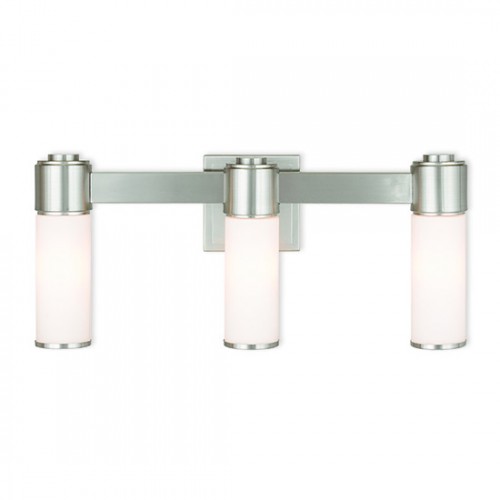 This stunning design features a brushed nickel finish studded with hand blown satin opal white glass. This sleek design will brighten up bathroom. Pair it with the mini chandelier to give your bath that extra wow factor!