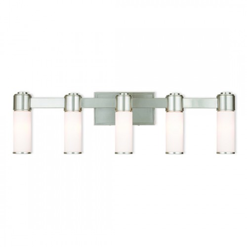 This stunning design features a brushed nickel finish studded with hand blown satin opal white glass. This sleek design will brighten up bathroom. Pair it with the mini chandelier to give your bath that extra wow factor!