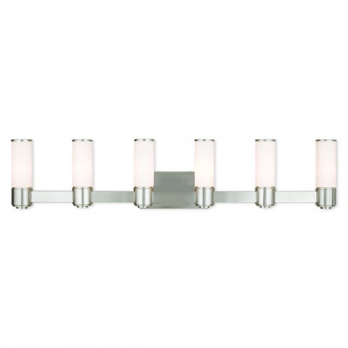 This stunning design features a brushed nickel finish studded with hand blown satin opal white glass. This sleek design will brighten up bathroom. Pair it with the mini chandelier to give your bath that extra wow factor!