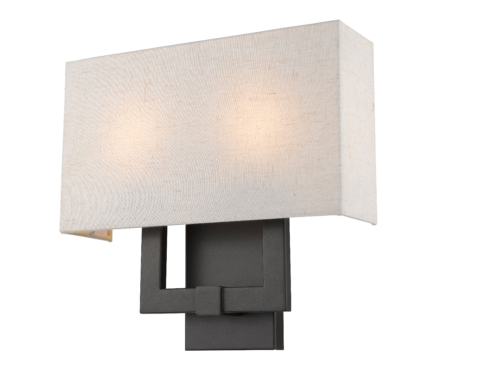 This wall sconce from the Meridian collection has a clean, crisp look and contemporary appeal. The sleek back plate and angular arm feature a english bronze finish. The hand crafted oatmeal fabric hardback shade offers warm light for your surroundings.