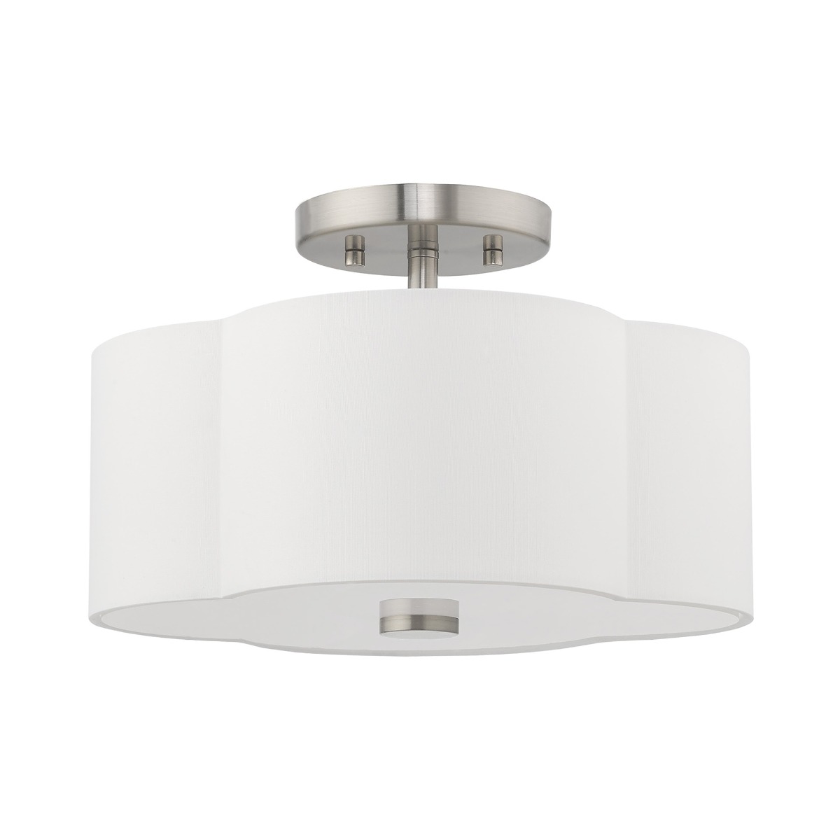 The Chelsea two light ceiling mount features a beautiful hand crafted clover shaped, off-White hardback shade situated on a brushed nickel frame with a white acrylic diffuser to hide the bulbs. It will be the perfect pick for a traditional to contemporary style.