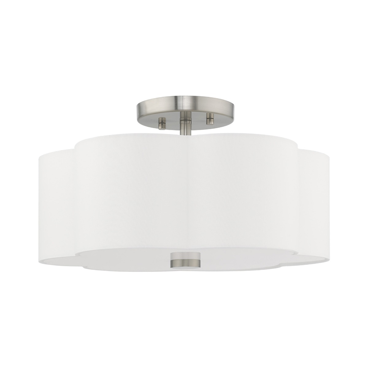 The Chelsea three light ceiling mount features a beautiful hand crafted clover shaped, off-White hardback shade situated on a brushed nickel frame with a white acrylic diffuser to hide the bulbs. It will be the perfect pick for a traditional to contemporary style.