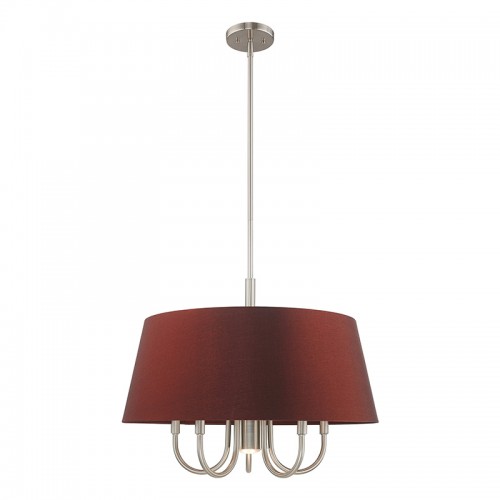 Add a dash of stylish sophistication with this sleek and contemporary pendant chandelier. The design features a brushed nickel frame and a beautiful hand crafted red wine hardback drum shade.