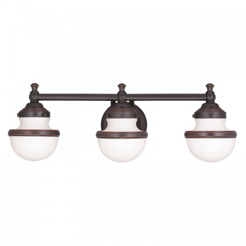 Sleek and simple lines define this beautiful olde bronze bath fixture. The clean, bold look of modernity blends with a raw industrial inspiration and hand blown white opal glass give this design a versatile and eclectic look that works with nearly any style of home decor.