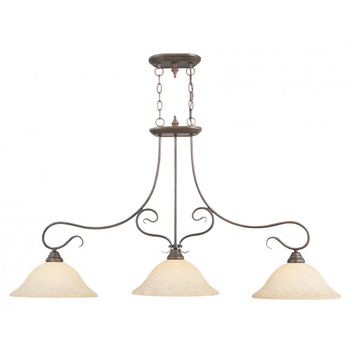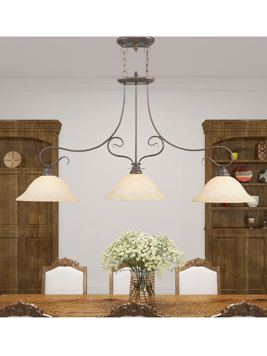 Classic imperial bronze three light linear chandelier paired with vintage scavo glass. Timeless in its vintage appeal, this light is stylish for both new and restored homes.