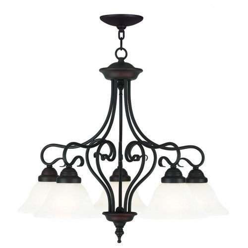 Classic bronze five light chandelier paired with white alabaster glass. Timeless in its vintage appeal, this light is stylish for both new and restored homes.