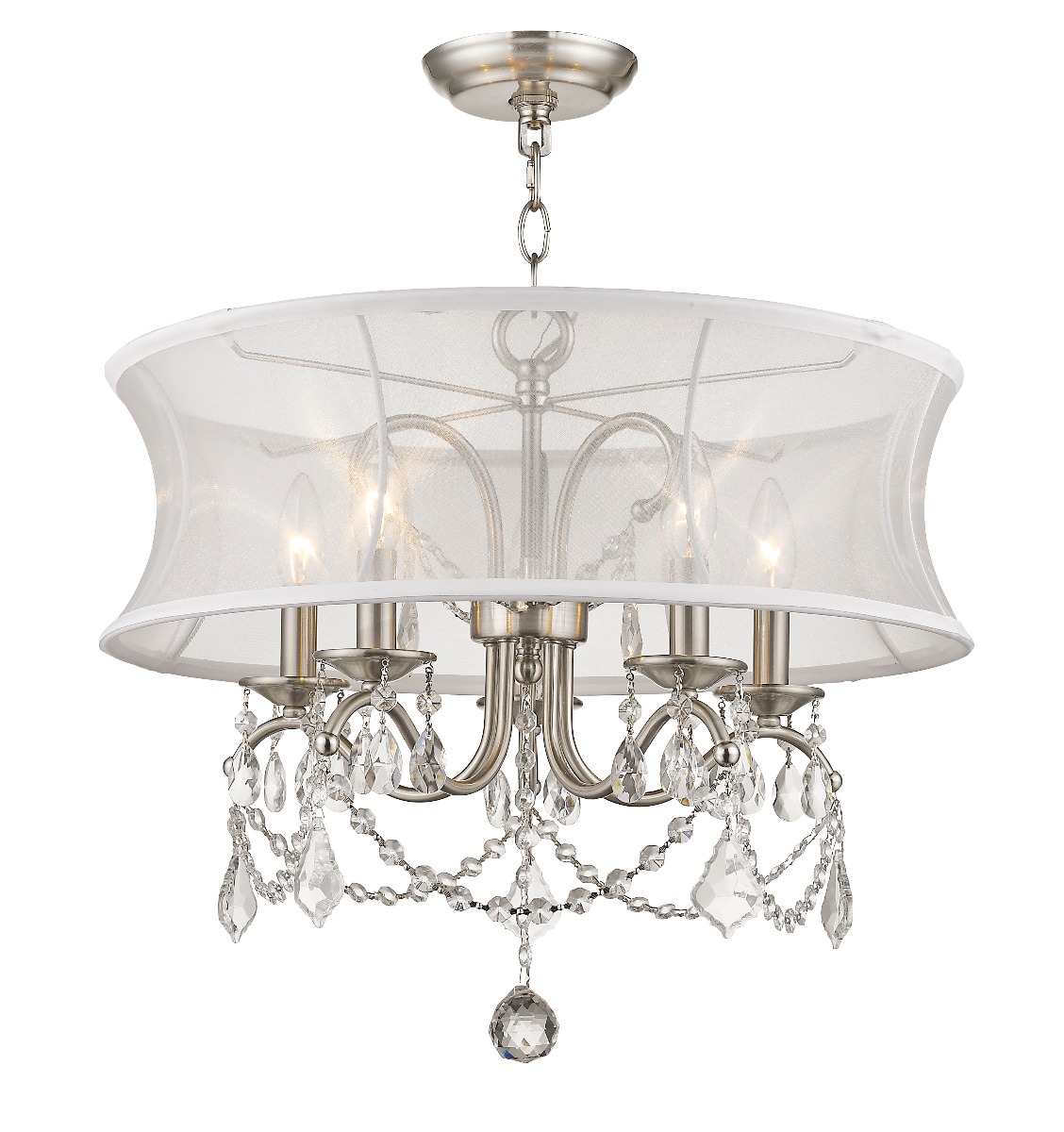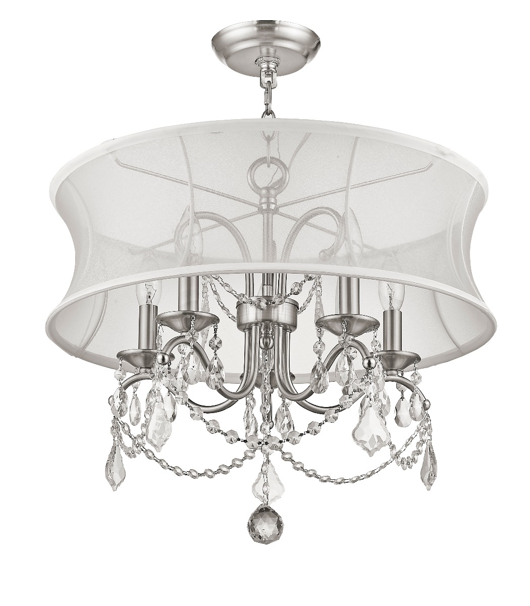 Add glamour to your home with this enchanting shaded chandelier. Scrolling arms adorned in a brushed nickel finish are paired with glittering crystal drops that reflect light when illuminated. A white handmade silk shimmer shade completes this chic design.