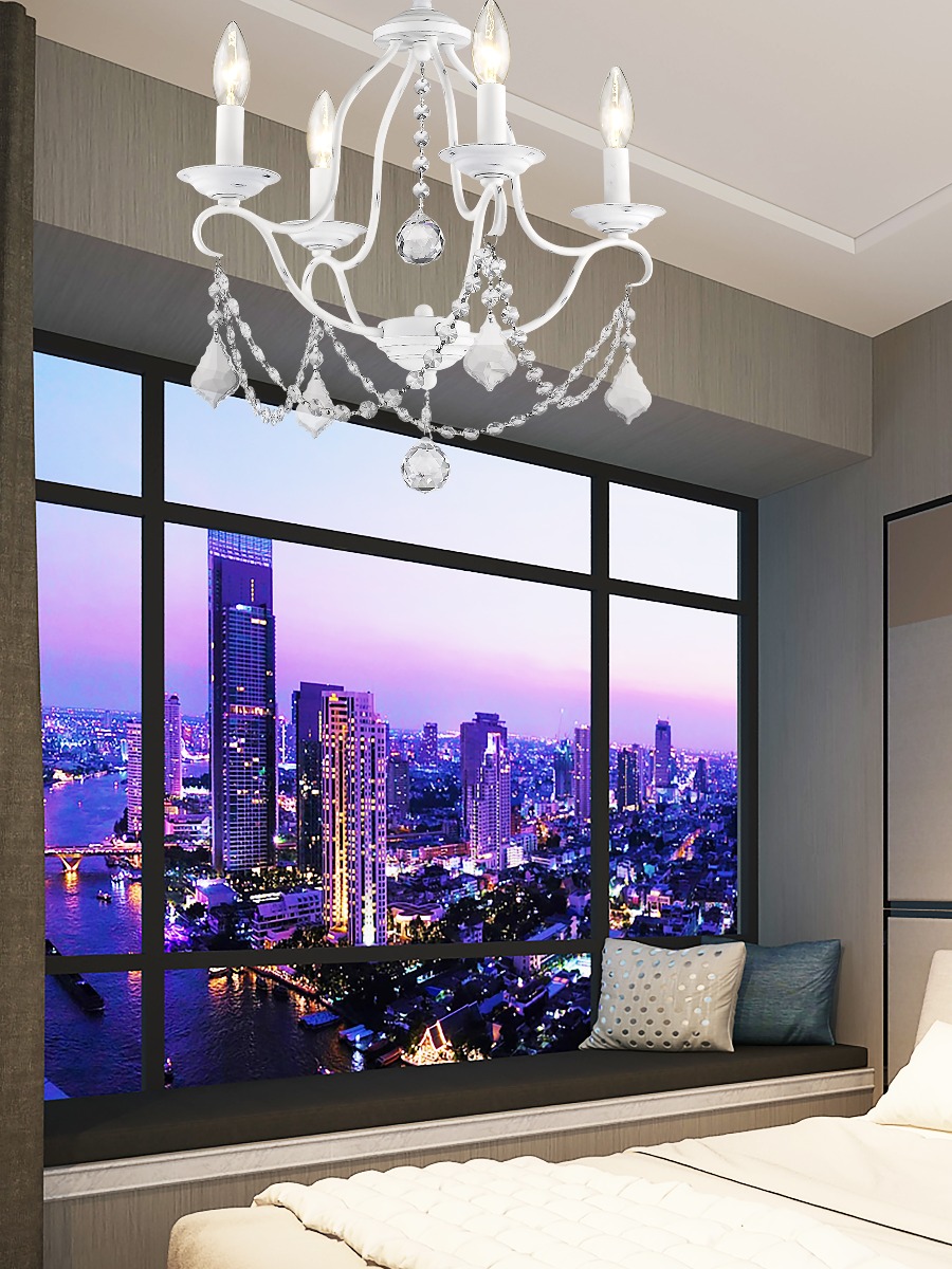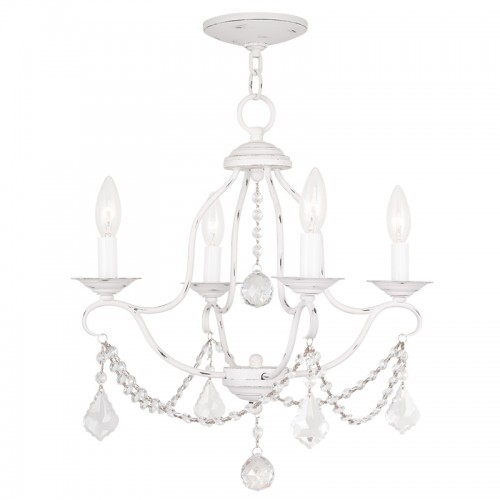 Simple elegance adorns the Chesterfield collection as strings of clear crystal gently cascade from a graceful frame of small scale tubing finished in antique white.