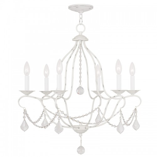 Simple elegance adorns the Chesterfield collection as strings of clear crystal gently cascade from a graceful frame of small scale tubing finished in antique white.