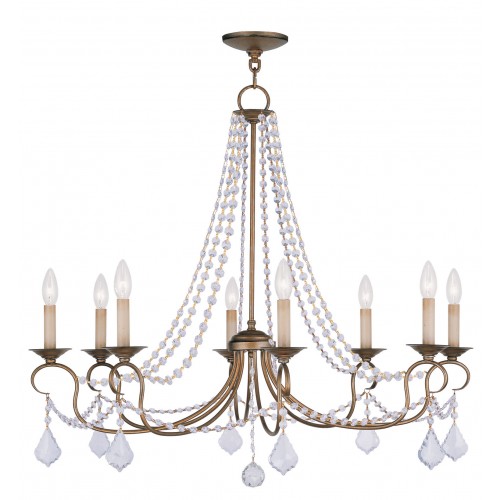 This intricately accented and masterfully forged eight light chandelier is from the Pennington collection. Finish is a antique gold leaf and features include gracefully sculpted arms and with sparkling clear crystal.