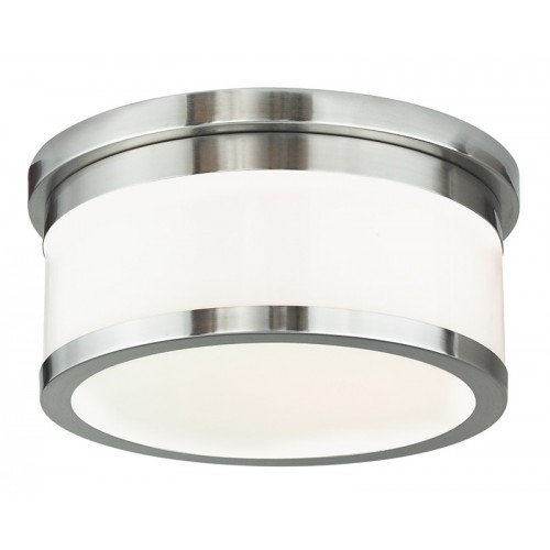 Smartly trimmed in brushed nickel bands, this hand blown satin opal white glass drum flush mount ceiling light looks equally stylish in bathrooms, hallways, and bedrooms.