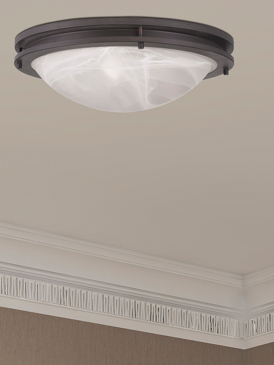 A strong, Art Deco-influenced ceiling light fixture. Features graceful bands of bronze encircling a white alabaster glass. A great lighting look for the kitchen, hallway, bathroom and more.
