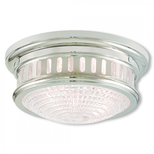 The classic simple design of this polished nickel flush mount makes it versatile to put any where. The clean lines give an updated look to the hand blown prismatic glass.