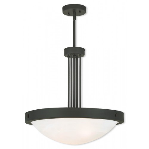 Classic and inviting, this pendant works well with any style of decor. Finished in bronze with white alabaster glass for soft illumination.